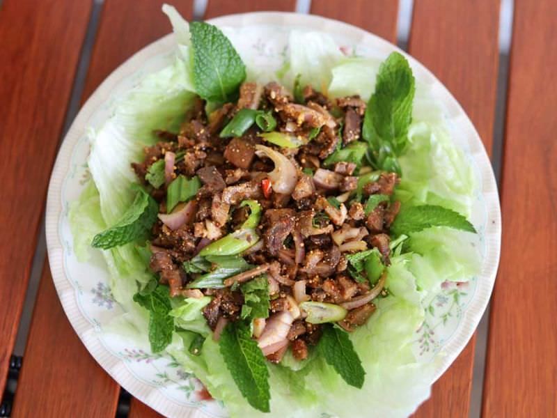 In Thai language, nam tok is a waterfall. This dish is usually cooked using a barbeque (the juices drip onto charcoal hence the name waterfall) but you can fry or broil the beef just as well. It should be cooked rare to start with. See our street vendor video lower left, a sidewalk chef prepares it.