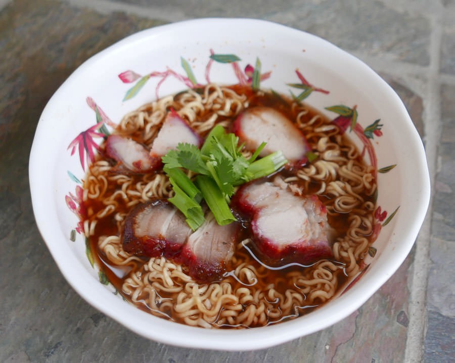 The instant noodles have a dark rich smoky broth, and it's not extremely spicy like other Mama noodles. This is namtok flavor. Add thinly sliced pork or beef as we did here in the photo, along with fresh cilantro, to make a more substantial meal.