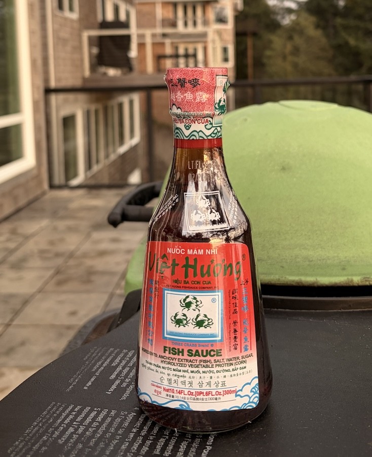This is an ultra-premium fish sauce manufactured by Three Crabs in the desirable small glass bottle.