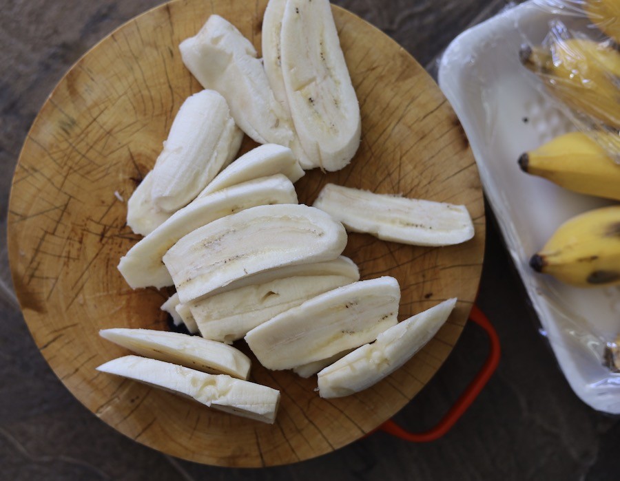 Slice lengthwise as shown, each banana slice into 3 or 4 pieces.