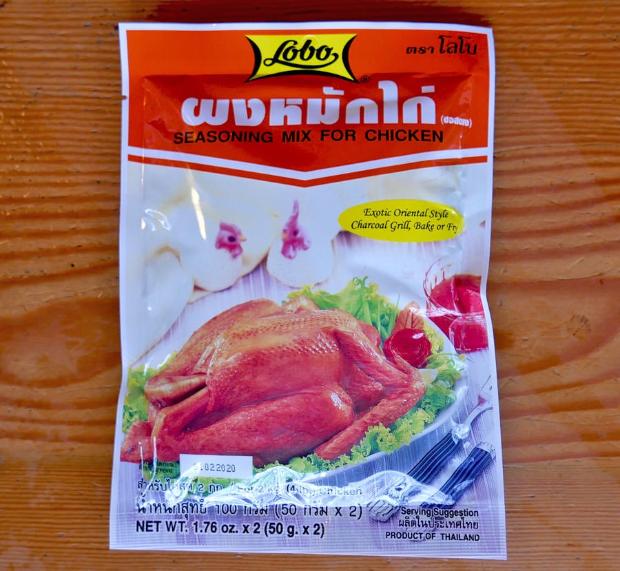Inside the package are two small sealed foil envelopes. The first one is the marinade powder, empty it into a bowl with a pound of chicken, 2 tablespoons of coconut milk, a bit of vegetable oil, mix and let marinade for an hour.